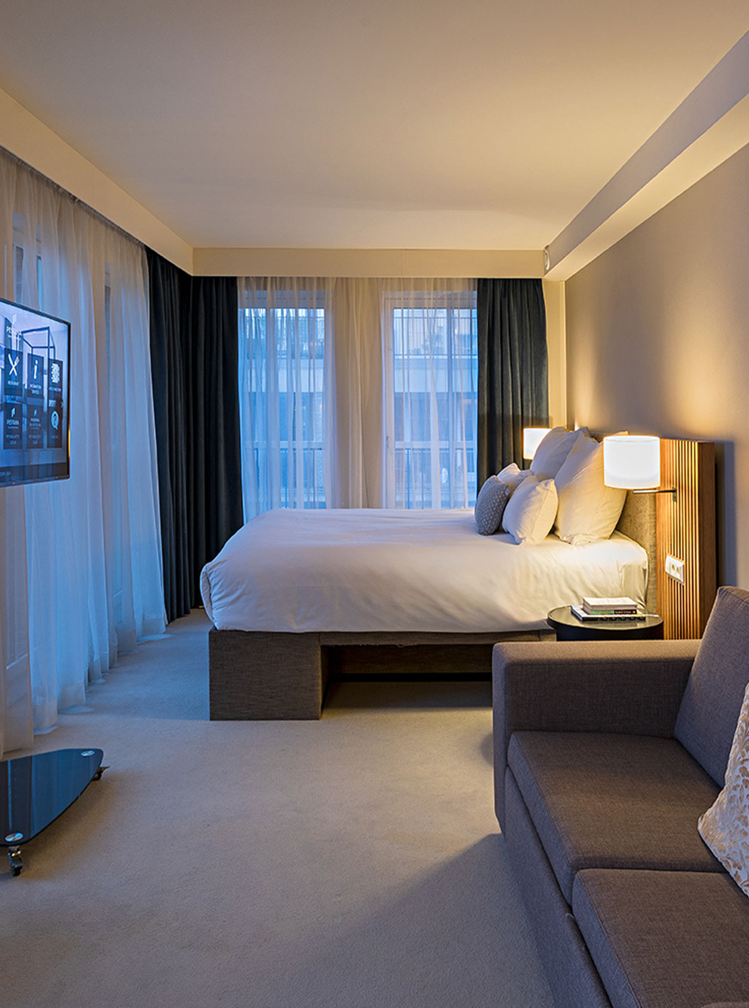 El cuarto Premium Deluxe del Pestana Amsterdam Riverside tiene una televisión frente a la cama y un escritorio con silla